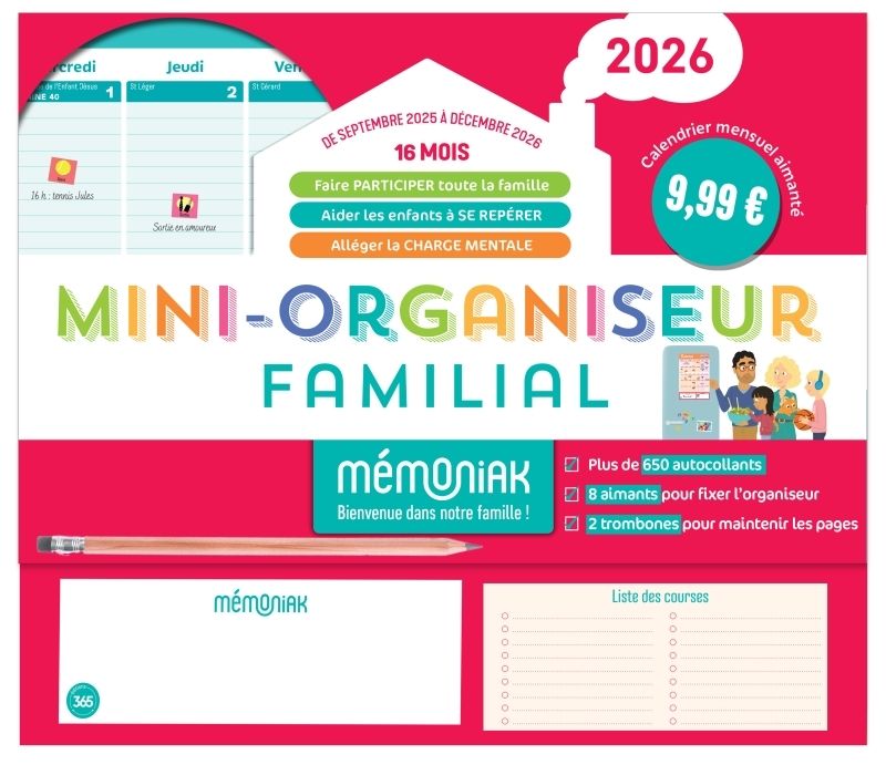Mini-organiseur Familial Memoniak 2026, Calendrier Mensuel, Sept. 2025 A Dec. 2026